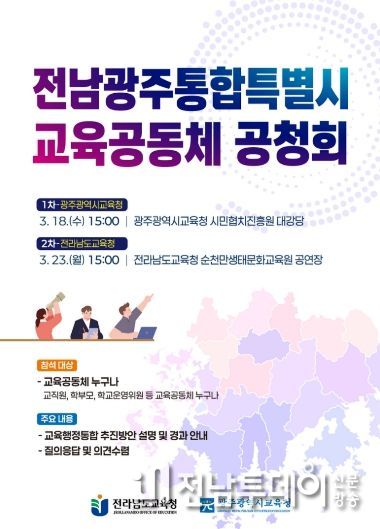 전남투데이 김용희 기자 | 전라남도교육청 ‘전남광주교육행정통합추진단’과 광주광역시교육청 ‘광주전남교육행정통합실무단’은 ‘전남광주통합특별시 교육공동체 공청회’를 3월 중 두 차례 개최한다.
