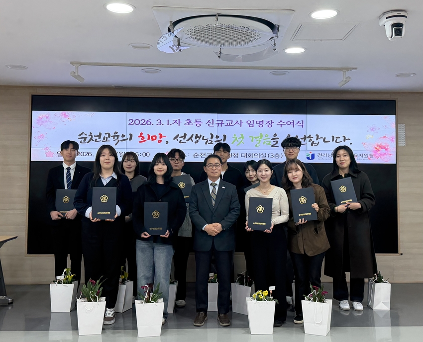 행사에는 3월 1일자와 3월 2일자로 순천 관내 초등학교에 첫 발령을 받은 신규교사 11명이 참석했으며, 임명장 수여를 시작으로 신규교사 선서, 교육장 격려사, 신규교사 소감 발표 순으로 진행했다. 신규교사들은 선서를 통해 학생을 존중하고 교육의 가치를 실천하는 교사로 성장하겠다는 의지를 다졌다. 행사장에는 첫 발령의 설렘과 책임감을 함께 나누는 따뜻한 분위기가 이어졌다.