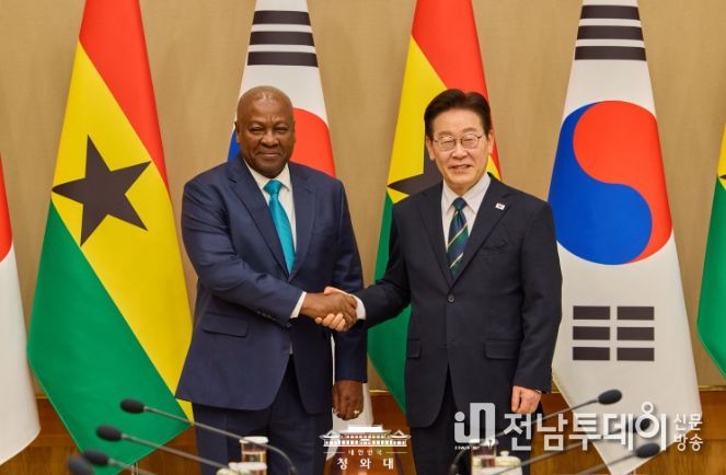 전남투데이 정홍균 기자 | 이재명 대통령은 11일 오후 우리나라를 실무 방한한 존 드라마니 마하마 가나 대통령과 정상회담을 가졌다고 강유정 청와대 대변인이 서면 브리핑을 통해 밝혔다.