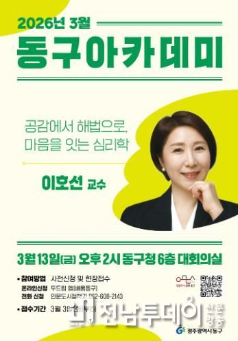 전남투데이 김경민 기자 | 광주 동구는 대표 평생학습 프로그램인 ‘2026년 동구 아카데미’가 오는 13일 이호선 숭실사이버대학교 교수의 강연을 시작으로 올해 첫 문을 연다고 밝혔다.