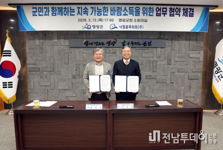 전남투데이 박세훈 기자 | 영광군은 지난 12일 영광군청 소회의실에서 ‘영광 낙월 해상풍력 발전사업’을 추진 중인 낙월블루하트㈜(대표 강현재)와 군민과 함께하는 지속 가능한 바람소득을 위한 업무 협약을 체결했다고 밝혔다.