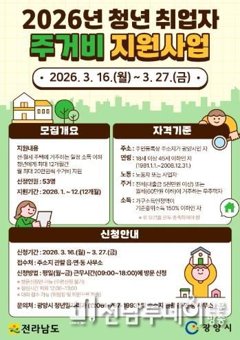 전남투데이 조평훈 기자 | 광양시는 지역에서 일하는 청년들의 주거비 부담을 완화하고 안정적인 생활 기반 마련을 위해 2026년 ‘청년 취업자 주거비 지원사업’을 추진하고 참여자를 모집한다고 밝혔다.