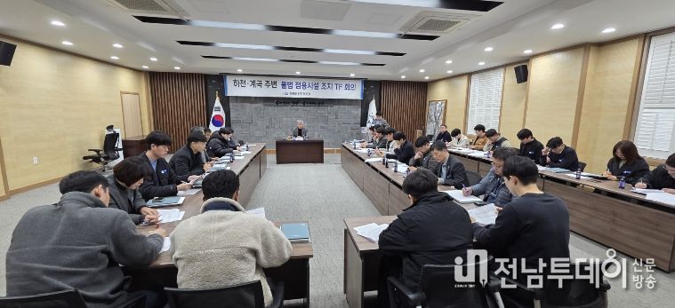 군은 지난 13일 군청 2층 소회의실에서 TF단장인 부군수 주재로 하천·계곡 주변 불법 점용시설 정비를 위해 관련 부서 및 읍·면 팀장과 담당자 등이 참석해 전수조사 추진 방안과 정비 계획을 공유했다. 이번 조치는 최근 국무회의에서 제시된 대통령 지시사항에 따른 후속 대응으로 마련됐다.
