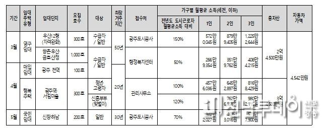 전남투데이 김경민 기자 | 광주광역시도시공사가 물가와 임대료 상승으로 주거 불안을 겪는 무주택 서민과 청년층을 위해 3월부터 5월까지 공공임대주택을 유형별로 순차 공급한다. 이를 위해 공공임대주택의 입주 절차와 자격 요건을 쉽게 확인할 수 있도록 5단계 ‘공공임대주택 릴레이 공급’ 타임라인을 전격 발표했다.