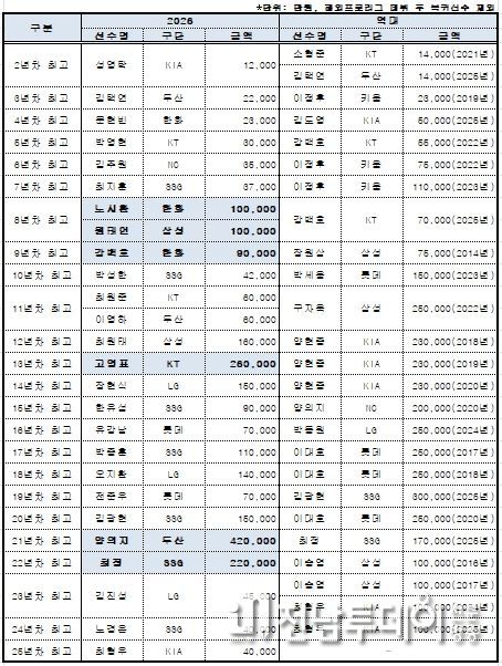 또한 2026시즌부터 시행되는 아시아쿼터 선수들의 연봉도 집계됐다. LG 웰스, SSG 타케다, 두산 타무라가 각각 20만 달러씩 받으며 아시아쿼터 선수 연봉(계약금 포함) 공동 1위에 올랐다.