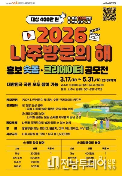 나주시 관계자는 “이번 공모전은 자유로운 형식의 영상 콘텐츠를 통해 나주의 매력을 새롭게 알리고 창의적인 홍보 콘텐츠를 발굴하기 위해 마련했다”며 “많은 국민이 참신한 영상으로 ‘2026 나주방문의 해’ 홍보에 함께해 주길 바란다”고 말했다.