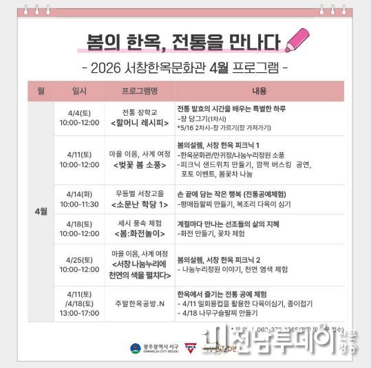 전남투데이 김경민 기자 | 광주광역시 서구가 도심 속 한옥에서 봄의 정취와 전통문화를 한자리에서 즐길 수 있는 특별한 경험을 선사한다. 서구는 4월 한 달간 서창한옥문화관에서 ‘봄의 한옥, 전통을 만나다’를 주제로 전통문화 프로그램을 운영한다.