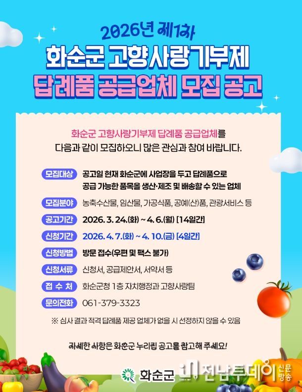 전남투데이 강영선 기자 | 화순군은 24일 고향사랑기부제 활성화와 기부자 만족도 제고를 위해 2026년 제1차 고향사랑기부제 답례품 및 공급업체를 모집한다고 밝혔다.