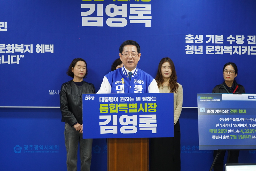 전남투데이 정홍균 기자 | 김영록 민주당 전남광주통합특별시 예비후보는 전남에서 선풍적인 인기를 끌고 있는 출생기본수당과 청년 문화복지카드 혜택을 광주까지 넓혀 시행하겠다고 24일 밝혔다.
