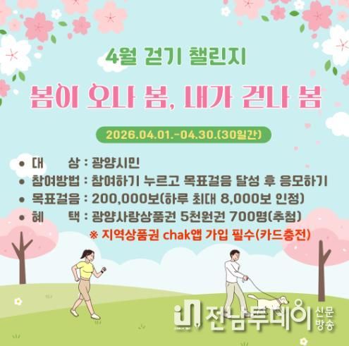 전남투데이 조평훈 기자 | 광양시는 오는 4월 1일부터 4월 30일까지 건강걷기 실천 모바일 걷기앱 워크온을 통해 ‘봄이 오나 봄, 내가 걷나 봄! 4월 걷기 챌린지’를 운영한다고 밝혔다.