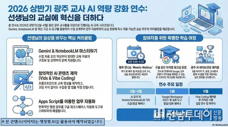 전남투데이 김경민 기자 | 광주시교육청은 오는 26일부터 초·중·고·특수학교 교원 280여 명을 대상으로 ‘2026 상반기 생성형 AI 역량 강화 연수’를 운영한다.