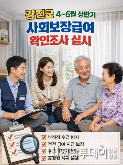 전남투데이 박동운 기자 | 강진군이 오는 4월부터 6월까지 2026년 상반기 사회보장급여 확인조사를 실시한다. 이번 조사는 부정수급을 예방하고 복지급여의 적정성을 높이는 동시에 지원이 필요한 가구를 다시 살펴 복지 사각지대를 줄이기 위한 것이다.