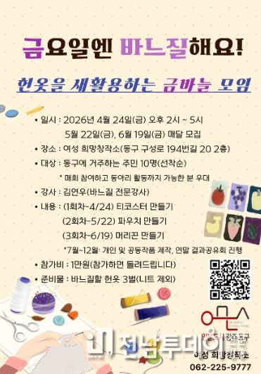 전남투데이 김경민 기자 | 광주 동구는 헌옷을 이용해 생활소품을 만드는 새활용 프로그램 ‘금요일엔 바느질해요! 헌옷을 새활용하는 금바늘 모임’ 참가자를 모집한다.