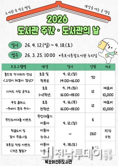 전남투데이 김용희 기자 | 목포어린이도서관은 2026년 도서관의 날 및 도서관 주간을 맞아 지역 주민을 위한 다채로운 독서문화 프로그램을 운영한다.