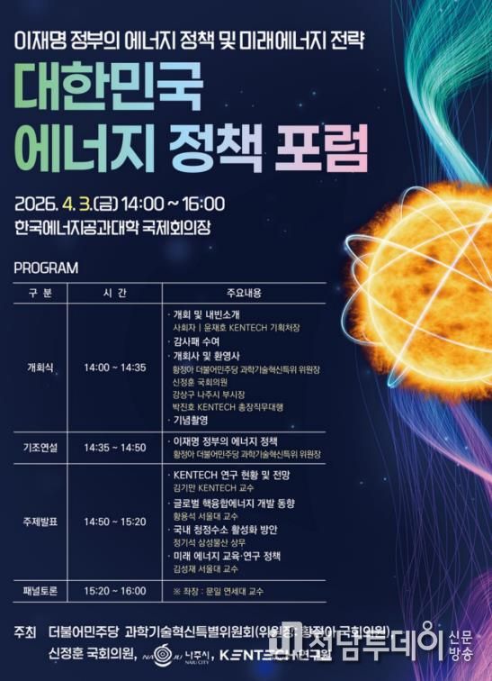 나주시는 더불어민주당 과학기술혁신특별위원회, 신정훈 국회의원, KENTECH 연구원과 함께 오는 4월 3일 오후 2시 한국에너지공과대학교 국제회의장에서 ‘대한민국 에너지 정책포럼’을 공동 개최한다고 27일 밝혔다.