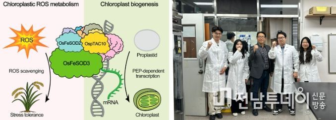 연구팀은 중요 식량작물인 벼를 활용한 연구를 통해 OsFeSOD3 단백질이 엽록체 유전자 발현을 담당하는 PEP(Plastid-encoded RNA polymerase) complex의 구성 요소로 작용하며, 엽록체 발달을 조절하는 핵심 인자임을 규명했다.