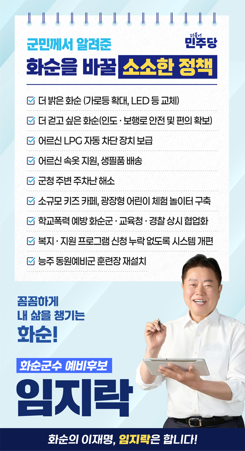 임 예비후보가 밝힌 ‘소소한 정책’은 총 9가지로 ▲더 밝은 화순(가로등 확대, LED으로 교체) ▲더 걷고 싶은 화순(인도·보행로 안전 및 편의 확보) ▲어르신 LPG 자동 차단 장치 보급 ▲어르신 속옷 지원, 생필품 배송 ▲군청 주변 주차난 해소 ▲소규모 키즈카페, 광장형 어린이 체험 놀이터 구축 ▲학교폭력 예방 화순군·교육청·경찰 상시 협업화 ▲복지·지원 프로그램 신청 누락 없도록 시스템 개편 ▲능주 동원예비군 훈련장 재설치 등이다.