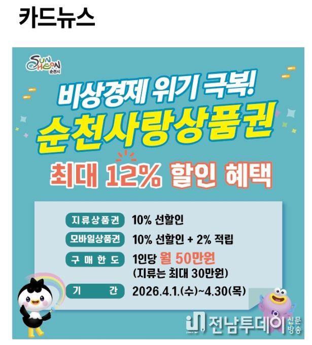 전남투데이 조평훈 기자 | 순천시가 최근 중동 사태 등 대외 불확실성에 따른 생활물가 상승으로 어려움을 겪는 시민과 소상공인의 생활경제 안정을 위해 4월 한 달간 순천사랑상품권 할인행사를 추진한다고 밝혔다.