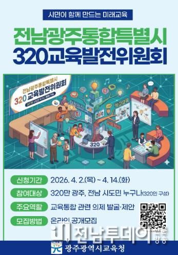 전남투데이 김경민 기자 | 광주시교육청은 광주・전남 교육행정 통합 시대를 대비하고 통합 이후 지역 교육의 미래 청사진을 그리기 위한 ‘전남광주통합특별시 320교육발전위원회’에 참여할 시도민 위원 320명을 공개 모집한다.