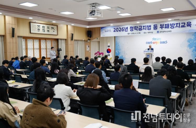 전남투데이 김경민 기자 | 광주시교육청은 2일 본청 대회의실에서 고위 공직자를 포함해 모든 직원을 대상으로 ‘2026년 청탁금지법 등 부패방지교육’을 실시했다.