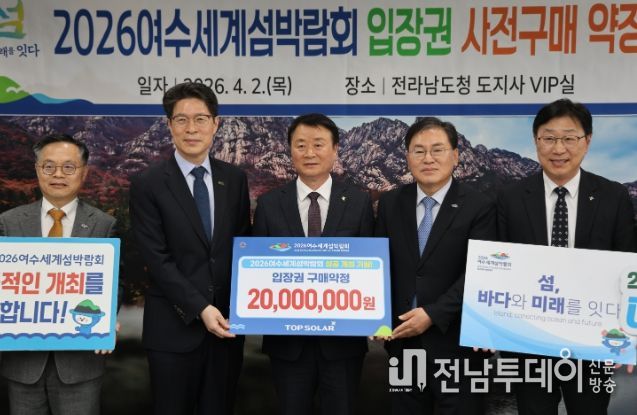 전남투데이 조평훈 기자 | (재)2026여수세계섬박람회조직위원회는 4월 2일 전남도청 VIP실에서 탑솔라㈜와 ‘2026여수세계섬박람회 입장권 구매약정식’을 개최했다고 밝혔다.