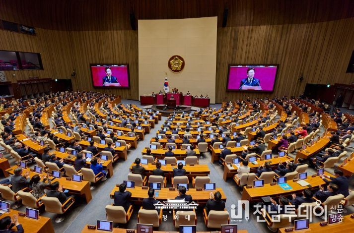 이어 "중동 전쟁으로 촉발된 위기를 슬기롭게 해결해 나가고 경제체질 개선의 기회로 삼아 우리 경제를 다시는 흔들리지 않는 반석 위에 올려놓아야 한다"며 "위기 극복의 성패는 속도에 달려 있다. 이번 예산안이 신속히 통과될 수 있도록 초당적인 협력을 부탁한다"고 말했다.