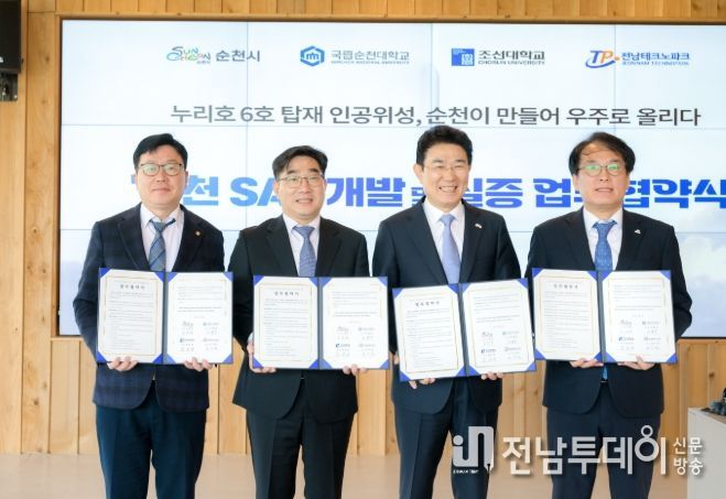 순천시는 3일 정원워케이션센터에서 국립순천대학교 ‧ 조선대학교 ‧ 전남테크노파크와 업무협약을 체결하고, 위성 개발부터 실증까지 이어지는 순천형 우주산업 기반 조성에 속도를 낸다고 밝혔다.