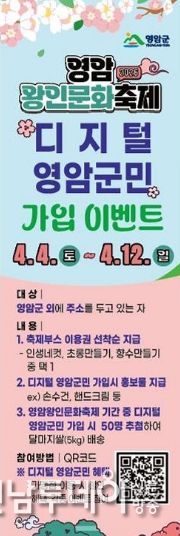김선미 영암군 인구청년과장은 “디지털 영암군민은 누구나 1분이면 간편하게 가입할 수 있다”며 “축제를 찾은 방문객들이 디지털 군민이 되어 영암과 지속적인 인연을 이어가길 바란다”고 말했다.