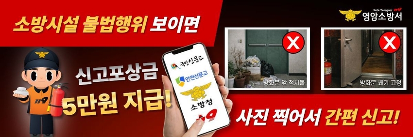 전남투데이 박상훈 기자 | 영암소방서(서장 이병산)는 비상구 폐쇄 등 소방시설 관련 불법행위를 근절하고 화재로부터 군민의 생명과 재산을 보호하기 위해 ‘소방시설 불법행위 신고포상제’를 연중 운영한다고 밝혔다.