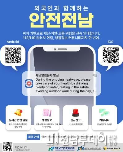 한편, ‘다국어 안전전남 앱’은 스마트폰 앱스토어에서 무료로 내려받을 수 있다.