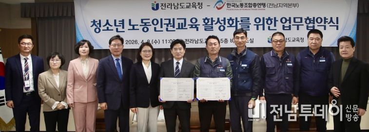 전남투데이 김용희 기자 | 전라남도교육청은 4월 8일 청사 5층 비즈니스실에서 한국노동조합총연맹 전남본부와 ‘청소년 노동인권 보호·증진’을 위한 업무협약을 체결했다.