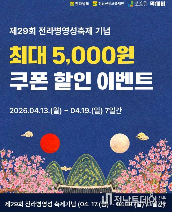 전남투데이 박동운 기자 | 강진군이 ‘제29회 전라병영성축제’를 맞아 오는 13일부터 19일까지 7일간 공공배달앱 ‘먹깨비’ 이용자를 대상으로 파격적인 할인 이벤트를 추진한다.