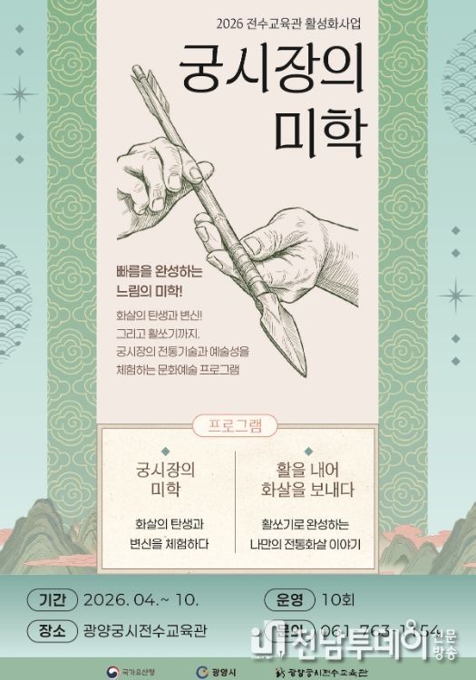 전남투데이 조평훈 기자 | 광양궁시전수교육관은 국가유산청과 광양시가 주최하는 '2026 전수교육관 활성화사업'을 4월부터 본격 운영한다고 밝혔다.