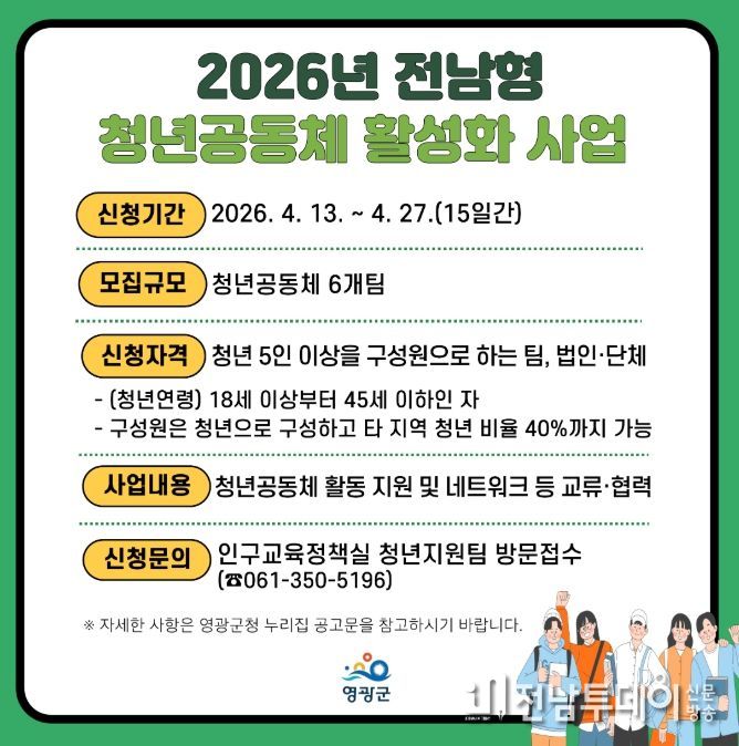 전남투데이 박세훈 기자 | 영광군은 청년들의 지역 활동 기반을 마련하고 지역사회 활동 주체로 성장할 수 있도록 지원하기 위해 오는 4월 27일까지 ‘2026년 전남형 청년공동체 활성화 사업’ 참여팀을 모집한다고 밝혔다.