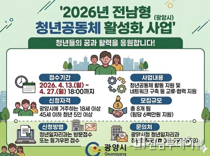 전남투데이 조평훈 기자 | 광양시는 4월 13일부터 4월 27일까지 ‘2026년 전남형 청년공동체 활성화 사업’에 참여할 청년공동체를 모집한다.