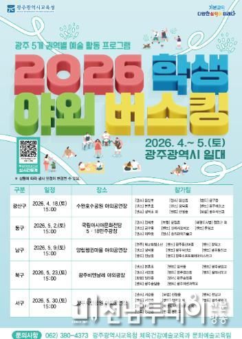 전남투데이 김경민 기자 | 광주시교육청이 오는 18일부터 5월 30일까지 광주 5개 자치구에서 45팀, 348명이 참여하는 ‘2026 학생 야외버스킹’을 개최한다.