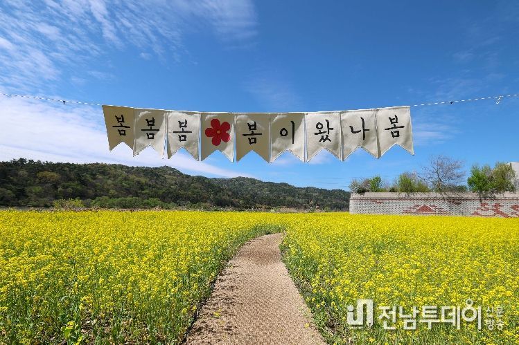 봄을 맞아 유채꽃이 활짝 피면서 바람에 일렁이는 노란 꽃물결과 황룡강의 물빛이 어우러져 한 폭의 그림 같은 풍경을 연출하고 있다.
