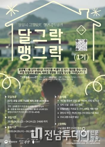전남투데이 조평훈 기자 | 광양시는 청년복합공간 개소에 앞서 4월 10일부터 24일까지 청년 창업 프로그램 ‘청년 창업 달그락 맹그락 1기’ 참여자를 모집한다.