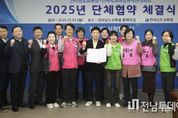 전남투데이 김용희 기자 | 전라남도교육청과 전국학교비정규직연대회의가 15일 교육 현장의 노사 상생을 통한 교육 공무직원의 권익 신장과 근로 여건 개선을 골자로 한 ‘2025년 단체협약’을 체결했다. 이날 전남교육청에서 열린 체결식에는 김대중 전남교육감과 연대회의(참여노조: 전국학교비정규직노동조합, 공공운수노동조합 전국교육공무직본부, 전국여성노동조합) 각 노조 대표자를 포함한 양측 관계자 30여 명이 참석해 협약서에 서명하며 상호 발전을 약속했다. 본문 118개 조, 직종별 37개 조, 부칙 7개 조 등 총 159개 조로 구성된 이번 단체협약은 교육공무직의 근로 여건 개선과 노동강도 경감 등 근로 환경을 획기적으로 개선하는 내용을 담고 있다. ▶복지 향상 및 휴가 확대 질병으로 인한 유급병가 기간을 기존 30일에서 60일로 두 배 확대하여 공무원과 동일하게 반영함으로써 교육공무직들의 건강권이 강화됐다. 또한, 장기재직휴가가 신설되어 10년 ~ 20년 미만 5일, 20년 이상 10일의 유급 휴가를 사용할 수 있게 됐다. ▶출산, 육아 지원 강화 배우자 출산휴가가 5