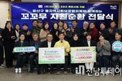 전남투데이 김경민 기자 | 광주 광산구는 민관 협력으로 추진한 지난해 ‘꼬리에 꼬리를 무는 자원순환 나눔 활동’으로 버려진 이불, 의류 등 15톤 이상이 재활용되고, 이 수익에 기부가 더해져 총 800만 원이 지역사회에 환원됐다고 밝혔다. 27일 광산구청 2층 상황실에서 광산구 동 지역사회보장협의체 월례 회의와 연계해 ‘꼬꼬무 자원순환’ 수익금 전달식이 열렸다. ‘꼬꼬무 자원순환’은 광산구 동 지사협, ㈜지티월드, 투게더광산 나눔문화재단 등이 함께 자원순환을 실천하고, 그 수익금을 지역사회에 환원하는 사업이다. 각 기관‧단체는 지난해 4월 업무협약을 체결, 주민 참여를 바탕으로 소각 등 처리가 어려운 폐이불, 폐의류 등을 수거해 자원순환 업체에 연계하는 활동을 진행했다. 지난 한 해 광산구 전역에서 폐이불 약 13톤, 버려진 옷 2.1톤 등 15.2톤을 수거해 재활용하는 성과가 있었다. 광산구 동 지사협은 지난해 4월 1차로 폐이불 등 6.4톤을 수거‧재활용해 모인 100만 원의 수익금을 바탕으로 폭염 취약계층에 선풍기 등 냉방용품을 지원했다. 이날 전달식에선 2차 수익금 100만 원에 ㈜지티월드가 사업 취지에 공감해 추가