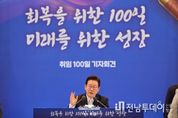 전남투데이 정홍균 기자 | 이재명 대통령은 11일 "오늘부터 임기 마지막 날까지 '국민이 주인인 나라, 함께 행복한 대한민국'을 만드는 길에 매진하겠다"고 밝혔다. 이 대통령은 이날 오전 10시 청와대 영빈관에서 '회복을 위한 100일, 미래를 위한 성장'을 주제로 열린 취임 100일 기자회견에서 "앞으로 남은 4년 9개월은 '도약과 성장의 시간'"이라며 이같이 말했다. 이 대통령은 "인수위도 없이 출범한 정부가 이제 본격적인 출발선에 섰다"며 "우리 경제가 다시 성장하고, 대한민국이 힘차게 도약할 수 있도록 총력을 기울이겠다"고 밝혔다. 이어 "세계를 이끄는 혁신경제로 '진짜 성장'을 추진하고, 성장의 결실을 국민 모두가 나누는 '모두의 성장'을 이뤄내겠다"며 "기본이 튼튼한 사회를 구축해 국민의 삶도 빈틈없이 지켜내겠다"고 말했다. 이 대통령은 "당당한 실용외교로 세계 속에서 우뚝 서고 국민의 평화로운 일상을 지켜내겠다"며 "모든 국민을 아우르고 섬기는 '모두의 대통령'이 되겠다는 약속에 따라 통합의 정치와 통합의 국정으로 나아가겠다"고 밝혔다. 또 "외교 정상화에 만족하지 않고, 대한민국의 국격과 위상을 더욱 높일 수 있도록 앞으로도 최선을 다하겠다"며