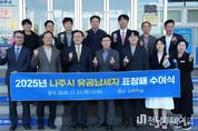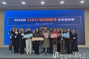 전남투데이 김윤걸 기자 | 전라남도 나주시가 청년의 창의적 아이디어와 자발적 참여를 통해 지역의 활력을 높이고 지속 가능한 공동체 문화를 확산하기 위한 ‘2025 청년공동체 활성화사업’의 성과를 공유하며 청년정책의 새로운 방향을 제시했다. 나주시는 지난 10일 나주시청 대회의실에서 ‘2025 청년공동체 활성화사업 성과공유회’를 개최했다고 12일 밝혔다. 이번 행사는 한 해 동안 청년들이 주도적으로 추진한 공동체 활동의 성과를 돌아보고 지역사회를 위해 헌신한 청년들의 노력을 격려하기 위해 마련됐다. ‘청년공동체 활성화사업’은 청년들의 사회참여 확대와 지역 정착 기반 마련을 위해 청년공동체를 발굴 및 육성하고 다양한 활동을 통해 지역의 활력을 도모하는 사업이다. 올해 사업에는 환경 업사이클링 공예로 자원순환을 실천한 ‘나머지가 주인공’, 청년 창업가 네트워크를 구축한 ‘나주청년기업협회(NYEA)’, 청년 공예 작가들의 예술 교류를 이끈 ‘아르트벨’, 그림책을 활용한 로컬 관광상품을 개발한 ‘책이 피어나주’, 어르신 장수사진 촬영 봉사를 진행한 ‘청포도’ 등 5개 공동체가 참여했다. 참여 공