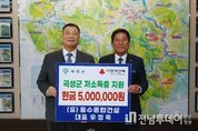 전남투데이 정홍균 기자 | 전남 곡성군은 지난 17일 여수시 화장동에 소재한 (유)용수종합건설(대표 우정욱)에서 곡성군 노인맞춤돌봄서비스 이용 어르신을 지원하기 위해 현금 500만 원을 기탁했다고 18일 밝혔다. 이번 기부금은 노인맞춤돌봄서비스 지원사업 수행기관인 곡성노인맞춤돌봄센터에서 돌봄서비스를 제공받는 912명의 어르신을 대상으로 추진되는 프로그램 운영에 활용될 예정이다. 기탁식에는 우정욱 대표를 포함하여 3명이 참석했으며, 우정욱 대표는“일상생활 영위가 어려운 취약 어르신들에게 적절한 돌봄서비스가 제공될 수 있도록 작은 정성을 보탤 수 있엉 매우 뜻깊다”라며, “앞으로도 지속적인 나눔 활동을 이어가겠다”라고 덧붙였다. 조상래 곡성군수는“어려운 경기 상황에서도 지역사회 취약 어르신들에게 온정을 베풀어 주신 용수종합건설 우정욱 대표에게 깊은 감사의 뜻을 표하며, 기부금이 노인맞춤돌봄서비스 대상 어르신들에게 잘 활용될 수 있도록 하겠다”라고 전했다.