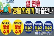 전남투데이 조평훈 기자 | 고흥군은 설 명절 연휴 기간 동안 생활폐기물로 인한 주민 불편을 최소화하고 쾌적한 생활환경을 유지하기 위해 설 연휴 생활폐기물 관리대책을 수립하고 본격 추진한다고 밝혔다. 군은 2월 14일부터 15일까지는 설 명절에 발생한 생활폐기물을 정상 수거하며, 이 기간 환경미화원 등 약 100명을 투입해 평소와 같이 안정적인 수거 서비스를 제공할 계획이다. 이어 2월 16일부터 18일까지는 연휴 중 발생하는 생활폐기물로 인한 불편을 최소화하기 위해 생활폐기물 기동반을 운영한다. 기동반은 2개 반 6명으로 구성되며, 고흥읍과 도양읍 시가지를 비롯한 상가 밀집지역을 중심으로 우선 수거를 실시하고, 긴급 민원이 발생하면 신속히 처리할 예정이다. 또한, 군은 연휴 기간 생활폐기물 적체와 무단 배출을 예방하기 위해 주요 도로변과 다중이용시설 주변을 중심으로 현장 관리를 강화한다. 아울러 수거 일정과 배출 요령을 군민에게 널리 알리기 위해 마을방송을 통한 읍·면별 안내를 실시하고, 주요 시가지 현수막 게시, 청사 및 고흥읍·도양읍 전광판 송출, 언론 보도 등 다양한 홍보 활동도