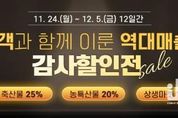 전남투데이 강영선 기자 | 화순군은 올해 화순팜 온라인 쇼핑몰 창설 이래 역대 최고 매출 달성에 보답하고자, 이달 24일부터 다음 달 5일까지 12일간'고객과 함께 이룬 역대 매출! 감사 할인전' 이벤트를 추진한다고 밝혔다. 이번 행사는 김장철, 연말 모임 행사 등 겨울나기를 겨냥한 특별 기획전으로 준비했다. 전 품목 20% 할인 쿠폰을 회원당 5매씩 지급하며, 축산물 ‘내 사랑 고기’ 코너를 통해 5% 추가 할인하는 등 일부 품목은 평상시보다 최소 25% 이상 저렴하게 구매할 수 있다. 또, 국거리 재료, 탕 제품 등을 모아 ‘뜨끈한 국물 기획전’을 진행한다. 이에 앞서 화순팜은 화순쌀에 대한 인식 제고와 지속적 쌀 소비 촉진을 위해 매월 실시하는'화순쌀 사는 날, 화순팜 rice day' 이벤트를 22일 시행했다. 기존 라이스 데이와 다르게 이번 행사는 2025년산 햅쌀 개시를 기념하여 정가 대비 –25% 수준으로 대폭 할인 판매를 단행했다. 안진환 농촌활력과장은 “한 해 동안 많은 관심과 성원에 감사를 표한다”라며, “연말까지 다양하고 풍부한 기획전을 통해 농가와 소비