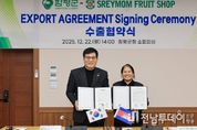 전남투데이 김길룡 기자 | 전남 함평군이 해외 시장에서 축적해 온 신뢰를 바탕으로 수출 확대의 결실을 맺으며, 글로벌 농식품 시장 공략에 속도를 내고 있다. 22일 함평군은, 캄보디아 현지 유통업체 SREYMOM FRUIT SHOP(이하 슬레이맘)과 이날 함평군청에서 샤인머스캣·딸기·태추단감 등 30만 불 규모의 농특산물 수출 확대 협약을 체결했다. 협약은 지난해 8월 27일 캄보디아 현지에서 체결한 ‘함평군 농산물 수출·입 업무협약(MOU)’ 이후 양측이 지속적인 협력 관계를 이어온 가운데, 그간의 수출 성과와 상호 신뢰를 바탕으로 수출 품목과 규모를 한 단계 확대하기 위해 추진됐다. 이날 협약식에는 함평군 관계자 8명과 온 슬레이맘 대표를 비롯한 슬레이맘 관계자 5명이 참석해 수출 확대 방안과 캄보디아 시장 진출 전략에 대해 의견을 교환하며 협력 의지를 다졌다. 협약에 따라 함평군은 기존 샤인머스캣 중심의 수출 구조에서 벗어나 딸기와 태추단감, 만감류까지 수출 품목을 확대해 농가의 판로를 넓히고 소득 증진에 힘쓸 계획이다. 군은 이번 캄보디아 수출 확대를 계기로 함평군 공식 수출 브