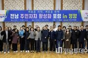 전남투데이 박상훈 기자 | 영암군이 두레살림사회적협동조합과 19일 가야금산조기념관에서 읍·면 주민자치위원 등 50여 명이 참석한 가운데 ‘전남 주민자치 활성화 포럼 in 영암’을 공동 개최했다. 이날 포럼은 주민자치에 대한 이해를 높이고, 다양한 의견을 청취하기 위해 마련된 자리. 민문식 전 광주도시재생공동체센터 대표이사는 포럼에서 ‘주민자치 정책의 흐름’을 주제로 주민자치회 제도를 공유했다. 나아가 영암형 주민자치회가 읍·면 생활권 기반 지역순환경제에 적합한 모델임을 강조하고, 제도적 지원 등 관련 향후 과제도 제시했다. 김영주 마을가치연구소 봄 대표는 ‘전남 주민자치 운영현황’ 발표에서 전국 대비 전남 주민자치회 구성 비율을 비교 분석하며, 마을공동체 활동이 활발한 지역일수록 주민자치력이 높다고 강조했다. 이어진 패널 토의에서는 시범 운영 중인 영암군 주민자치회 사례가 소개돼 박애진 영암읍 주민자치회 사무국장과 임영순 도포면 주민자치회 회장이 사례 발표에 나섰다. 질의응답 시간에는 주민자치회 운영 과정에서 마주하는 어려움과 제도 개선 방안 등에 대한 의견도 오갔다. &n