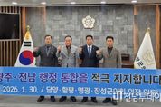 전남투데이 이현승 기자 | 담양군·함평군·영광군·장성군 전남 4개 군의회 의장단은 30일 영광군의회에서 전남–광주 행정통합을 염원하는 공동 퍼포먼스에 참여했다. 이번 퍼포먼스는 행정구역의 경계를 넘어 전남과 광주가 하나의 생활권이자 경제권으로 나아가기 위한 의지와 공감대를 확인하기 위해 마련됐다. 특히 지역 간 협력과 상생 발전의 필요성에 대해 지방의회 차원에서 뜻을 모았다는 점에서 의미를 더했다. 의장단은 이날 “행정통합은 지역의 미래 경쟁력 확보와 균형발전을 위해 더 이상 미룰 수 없는 중요한 과제”라며, “지금이야말로 전남과 광주의 미래를 결정할 최고의 적기”라고 입을 모았다. 장성군의회 심민섭 의장은 “각 시군 의회가 뜻을 모은 오늘의 행동이 향후 이어질 논의와 협력의 출발점이 되기를 기대한다”며, “군민의 목소리가 충분히 반영될 수 있도록 의회 차원의 역할을 지속해 나가겠다”고 강조했다. 한편, 4개 시군 의회는 앞으로도 전남–광주 상생과 공동 발전을 위한 논의와 협력을 이어갈 계획이다.
