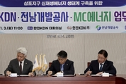 전남투데이 김윤걸 기자 | 에너지ICT 전문 공기업 한전KDN(사장 박상형)은 3일 광주전남공동혁신도시 소재 본사 17층 대회의실에서 전남개발공사, MC에너지와 함께 ‘삼포지구 신재생에너지 생태계 구축사업 업무협약’을 체결했다. 이날 협약식은 박상형 한전KDN 사장과 장충모 전남개발공사 사장, 정경오 MC에너지 대표이사를 비롯한 기관 관계자들이 참석한 가운데 협약의 취지에 대해 공유하고 각 기관의 협약 이행에 대한 계획, 협약서 서명, 오찬 등의 순서로 진행되었다. 한전KDN 등 세 기관은 협약을 통해 전남 영암 삼포지구를 대한민국 분산에너지 산업 도약의 전진기지로 육성하기 위한 대규모 협력사업을 본격 추진한다. 전남 영암 삼포지구에 구축되는 이번 사업은 태양광, 바이오가스, 수소 등 다양한 재생에너지원과 디지털 기반의 에너지 관리 기술 융합으로 삼포지구를 지속 가능한 분산형 에너지 허브로 발전시켜 전남 지역 에너지 전환의 실증무대이자 전국 확산형 모델의 중심지로 자리매김할 수 있도록 발전시킬 계획이다. 협약을 통해 전남개발공사는 사업부지 확보, 인프라 조성, 행정 지원을 담당하며 에너지 자립형 지역 모델을 구현하기 위한 기반 조성에 나서 전남도의 분산에너지