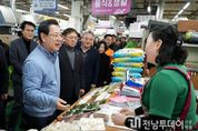 전남투데이 김용희 기자 | 김영록 전라남도지사는 13일과 16일 광양 중마시장과 여수 서시장주변시장을 방문, 물가 상승과 고금리 등에 따른 소비심리 위축으로 어려운 상인들을 격려하고 지역사랑상품권으로 장보기 행사를 펼친다. 김영록 지사는 13일 명절 물가 동향을 살피며 전남·광주 통합 추진에 따른 민생경제 지원 대책을 설명하고, 지역사랑상품권으로 설 제수용품과 지역특산품을 구매하며 상인들을 격려하고 애로사항을 청취했다. 특히 시장 상인들과 소통하며 지역경제의 근간인 시장 상인들이 안정적으로 영업하고 번창하도록 적극 지원할 것임을 밝혔다. 전통시장을 찾은 이용객과 인사를 나누며 넉넉한 인심이 있는 전통시장에 자주 방문할 것을 권장하고 가족과 함께 건강하고 풍요로운 명절을 보내길 바라는 덕담도 나눴다. 김영록 지사는 “지역경제와 직결된 공간인 전통시장 활성화 시책을 적극 발굴하고 지역 소상공인과 소통을 강화할 것”이라며 “도민들께서 지역 전통시장이 활기를 찾도록 많이 이용하길 부탁드린다”고 말했다.